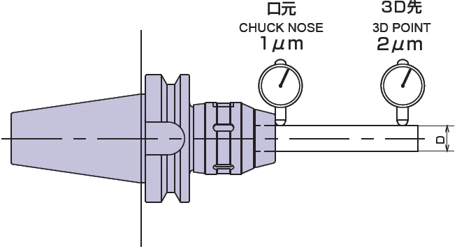 | AA級 口元1μ、3D先2μ保証 AA grade : 1µm at chuck nose, 2µm at 3×D guranteed. |